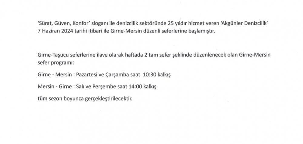 Akgünler Denizcilik, Girne-Taşucu seferlerine ek olarak, artık haftada iki kez Girne-Mersin arasında da yolcu taşıyacak. Girne'den Mersin'e Pazartesi ve Çarşamba günleri saat 10:30'da hareket eden seferler, Mersin'den Girne'ye ise Salı ve Perşembe günleri saat 14:00'te kalkacak. Bu yeni seferler, sezon boyunca devam edecek.