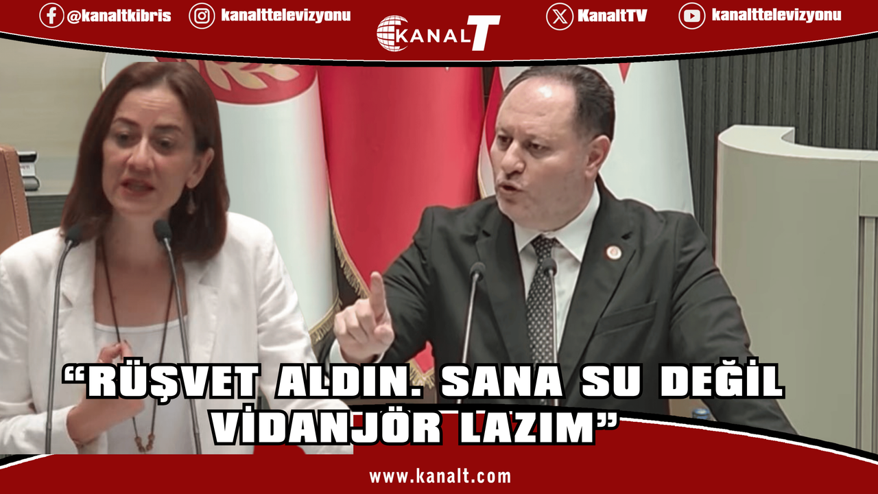 CTP Milletvekili Doğuş Derya da yerinden, “Rüşvet aldın. Sana su değil vidanjör lazım” diyerek bağırdı.