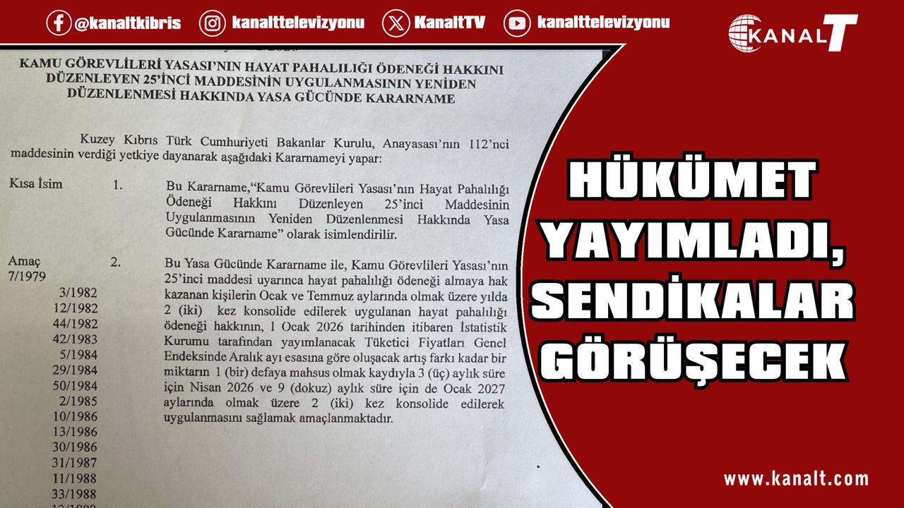 Resmi gazetede “Bu yasa gücünde kararname ile kamu görevlileri yasasının 25’inci maddesi uyarınca Hayat pahalılığı ödeneği almaya kazanan kişilerin Ocak ve Temmuz aylarında olmak üzere Yılda iki kez konsolide edilerek uygulanan Hayat pahalılığı ödeneği hakkının, 1 Ocak 2026 tarihinden itibaren İstatistik Kurumu tarafından yayımlanan tüketici fiyatları genel endeksinde aralık ayı esasına göre oluşacak artış farkı kadar bir miktarın, bir defaya mahsus olmak kaydıyla 3 aylık süre için Nisan 2026 ve 9 aylık süre için de, Ocak 2027 aylarında olmak üzere iki kez konsolide edilerek uygulanmasını sağlamak amaçlanmaktadır” ifadelerine yer verildi.